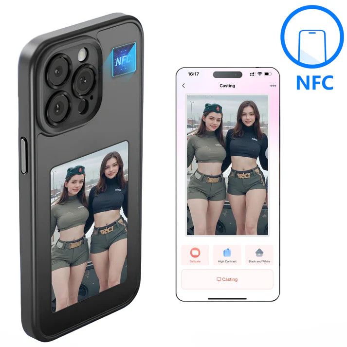 The E Ink Case, an energy-saving and eco-friendly phone case, uses NFC to wirelessly transmit data for screen projection. No batteries or cables are needed, it enables a customizable dual-screen experience directly on your phone case.